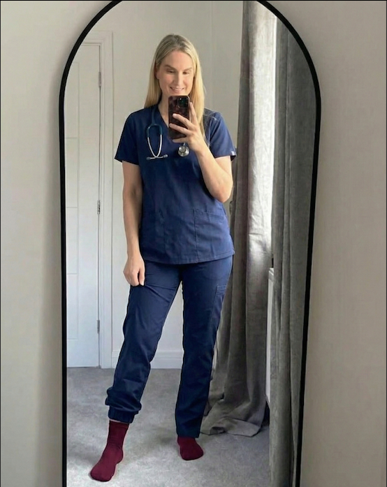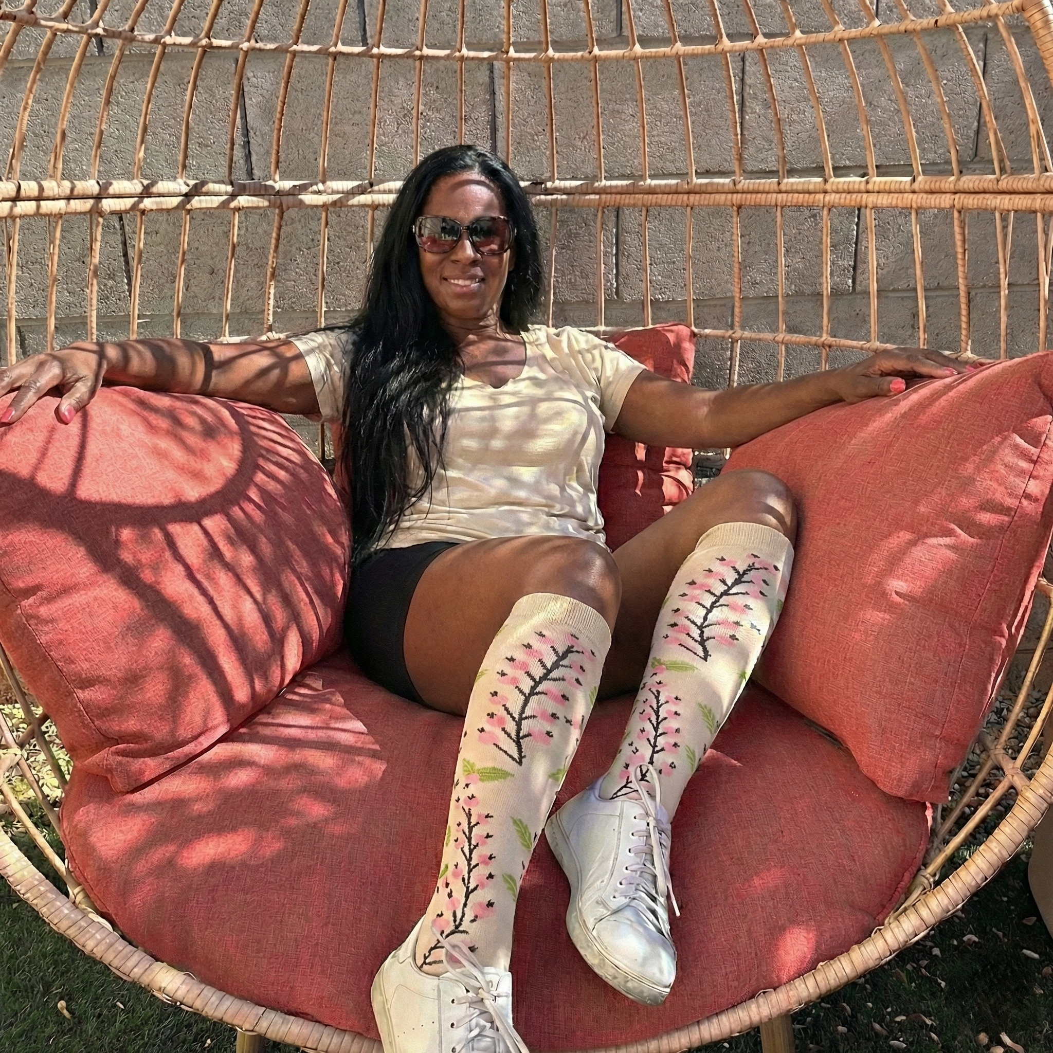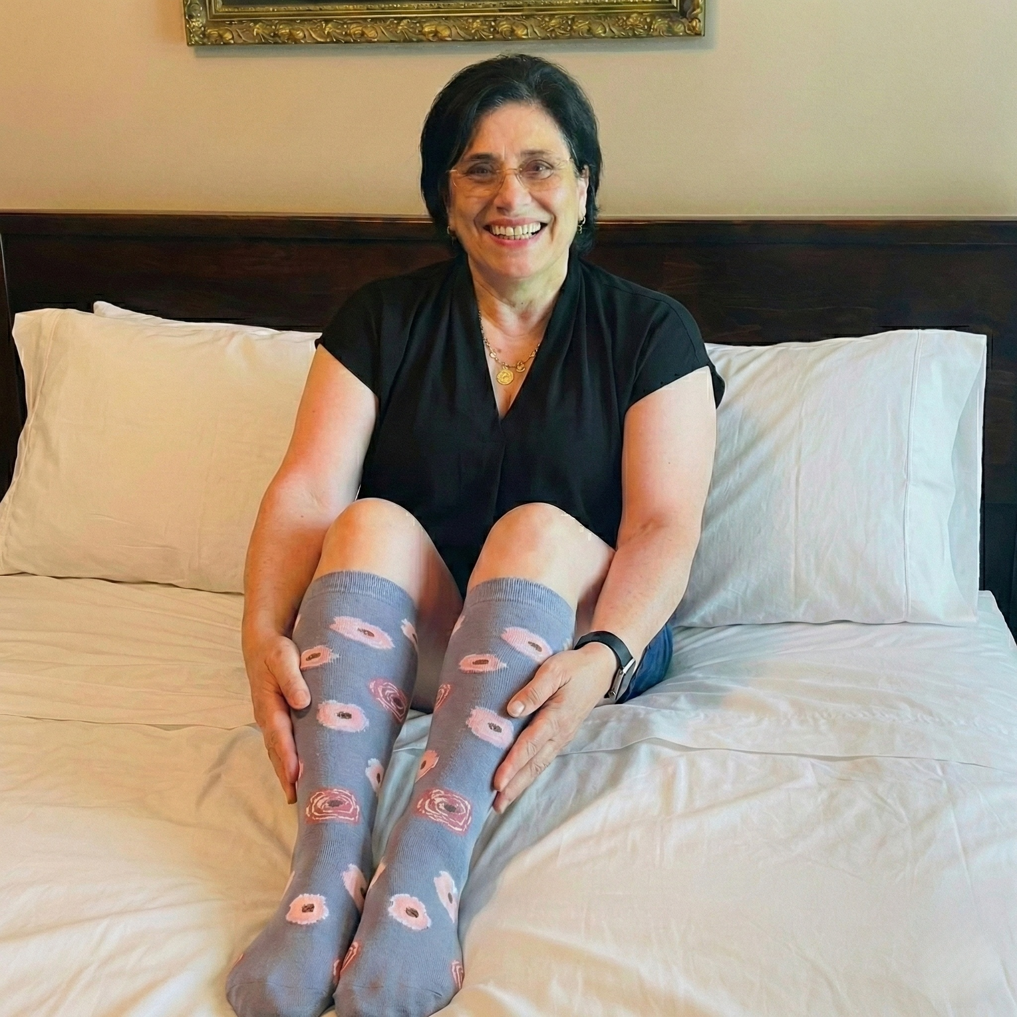 At the end of my usual 12 hr-shift ,I'm tired but not my legs. Prior to wearing these socks, my legs would swell and ache after work but not anymore. I took this picture right when i got back home, i don't even want to get them off. They so smooth and pretty.